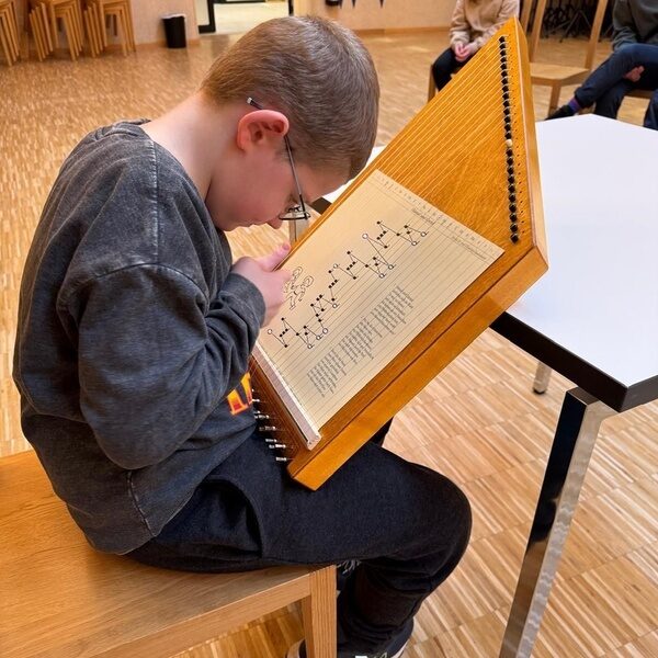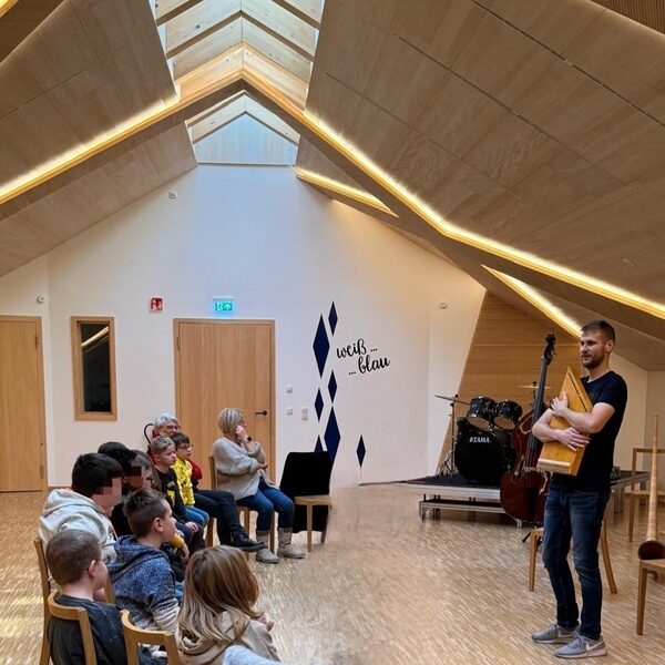 Unsere Gruppe 3 überlegte sich einen besonderen Start ins neue Jahr: sie besuchten die Volksmusikakademie in Freyung und wurden dort vom Musiklehrer Dominik Hilgart begrüßt. Er erklärte anschaulich verschiedene Instrumente, welche anschließend von den Kindern selbst ausprobiert werden durften. Ein erlebnisreiches Highlight war die Tischharfe: durch leicht verständlich dargestellte Notenkarten konnten die Kinder selbst ein Lied spielen.