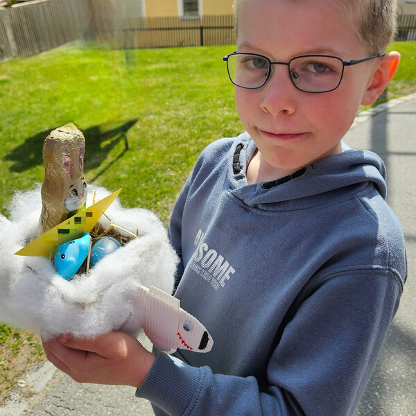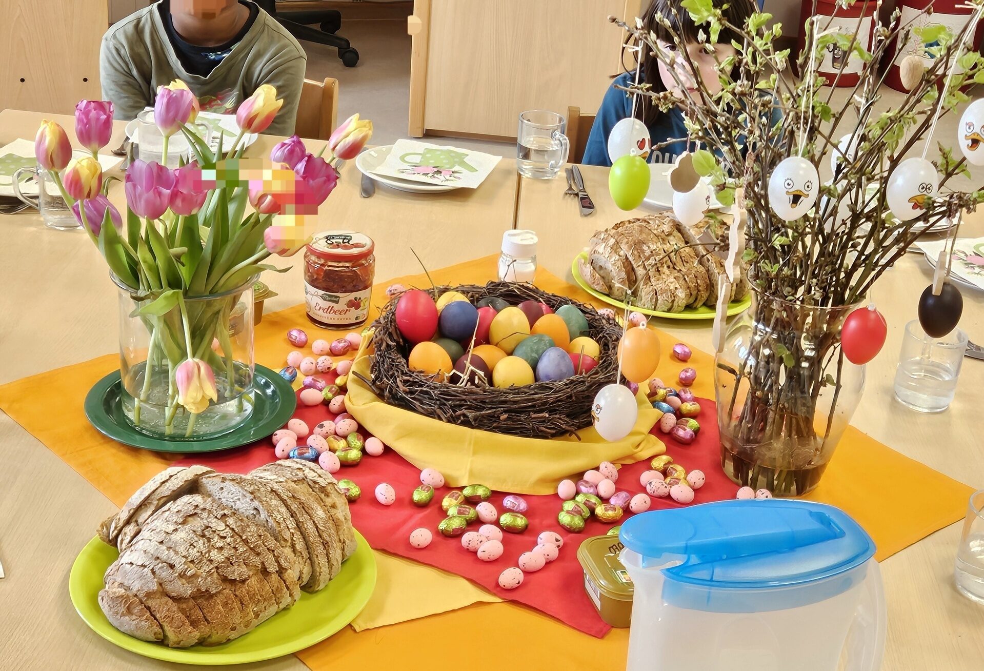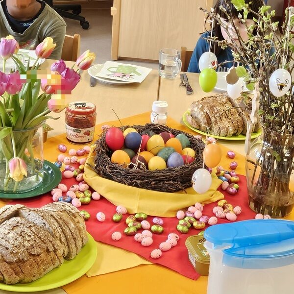 Die BetreuerInnen der Gruppe 2 machten die Ostergeschichte durch das Erzähltheater „Ostern feiern mit Emma und Paul“ lebendig und sorgten so für strahlende Kinderaugen. Danach stärkten sich noch alle durch das selbst gebackene Osterlamm sowie Butterbrote mit eigens angebauter Kresse. Natürlich durfte das traditionelle „Ostereier becka“ nicht fehlen.
